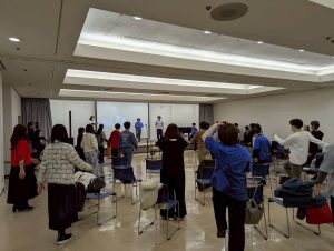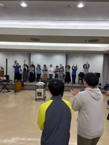 🟢ワークショップではどんぐり整骨院スタッフによる準備運動から始まり、ジョンルーカスさんのリードのもと発声の練習やリズムを感じながら