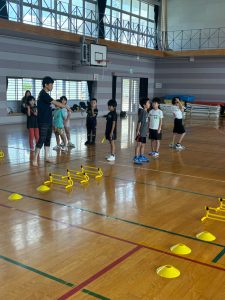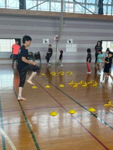🔵低学年の部は主に走るときの姿勢を教え、けんけん走りやミニハードルを使いよりアジリティ(敏捷性)を向上させるようなトレーニングを行いました!